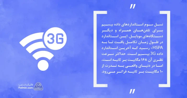 نسل سوم استانداردهای داده بیسیم برای تلفنهای همراه و دیگر دستگاههای موبایل. این استاندارد در طول زمان تکامل یافت تا به HSPA+ رسید که آخرین استاندارد داده 3G بیسیم است. حداکثر سرعت نظری آن 168 مگابیت بر ثانیه است، اما در دنیای واقعی به ندرت از 10 مگابیت بر ثانیه فراتر میرود.