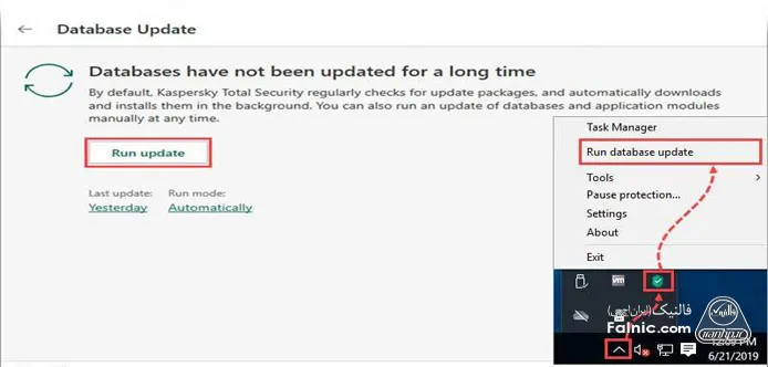 - روی آیکون کسپرسکی در بخش پایین و سمت راست نوار ابزار سیستم خود کلیک راست کرده و گزینه Run database update را انتخاب کنید.
